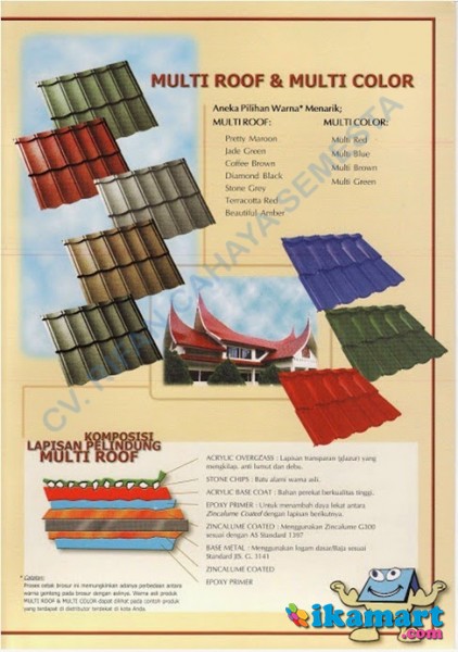 MULTIROOF dan MULTICOLOR adalah produk dengan jenjang tertinggi. Menghapuskan kekuatiran anda tentang atap bocor, genteng pecah, lumut atau jamur. Bahan metalnya yang kompak tetapi kokoh memberikan nilai tambah karena menghembat pemeliharaan dan tidak membebani konstruksi sebagaimana genteng jenis lain
