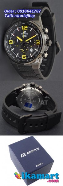 Model: Casio Edifice Chronograph EFR-515PB-1A9VDF (YELLOW) • Chronograph • Tachymeter • Stainless steel case • 100-meter water resistance • Date display between the 4 and 5 o'clock hour markers • EDIFICE logo stamped on the crown and back cover • Luminescent color hour markers Case / bezel material: Stainless steel Resin Band • 100-meter water resistance • Mineral Glass • Tachymeter • Screw Lock Back • Ion plated case • 1-second stopwatch Measuring capacity: 59'59 Measuring mode: Elapsed time • Date display • Regular timekeeping Analog: 3 hands (hour, minute, stopwatch seconds), 3 dials (timekeeping second, 24-hour, stopwatch minutes) • Accuracy: ±20 seconds per month • Approx. battery life: 2 years on SR927W • Size of case/total weight: 50 X 43.7 X 11.7 mm/87 g #1 Year Iwarranty#