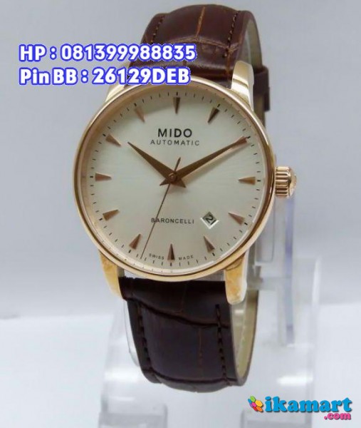 SPESIFIKASI:Mesin AutomaticRangka jam All Stainless Steel warna Gold Anti KaratTali dari Kulit warna CoklatAda fungsi TanggalWater Resistant 5ATMBelakang Jam Mesin Tampak Transfaran Diameter 4cm Super High QualityLengkap dgn Box Khusus Jam MidoSTOK TERBATAS