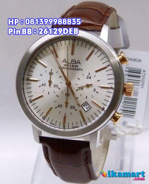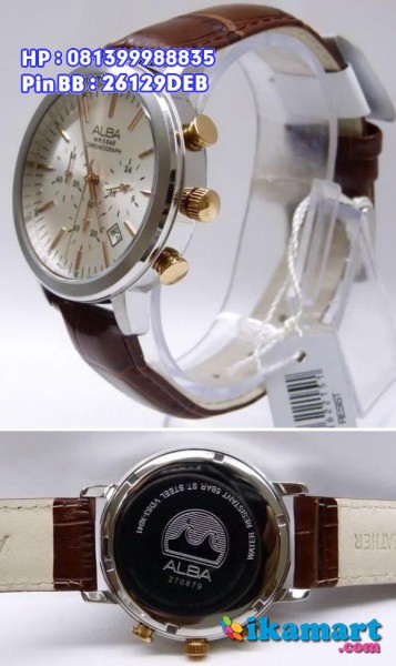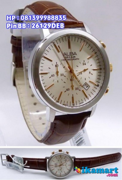 SPESIFIKASI:Quartz System Bahan Jam All Solid stainless steel warna silver Micron (anti karat)Tiga Jarum chrono aktif dan berfungsi(fungsi stopwatch & am/pm)Tali kulit warna CoklatAda fungsi tanggalDaya tahan baterai 3 tahunWater Resistant 5 BAR (50 meter)Diameter Lingkaran 4,1cm100% Original Alba WatchBergaransi Rermi 1 Tahun