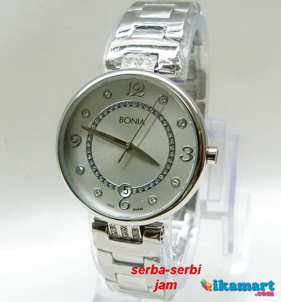 SPESIFIKASI:Mesin Baterai (quartz).Bahan Jam All Solid Stainless Steel.Stainless steel warna Silver (tdk karat & tdk mengulupas)DiHiasi butiran batu Swarovski (tdk mudah lepas)Diameter Lingkaran Jam 3,5 cm.Posisi tanggal di angka 6.Water Resistant 3ATMDaya tahan Baterai hingga 2 tahun.Termasuk Kotak mewah Jam Bonia.
