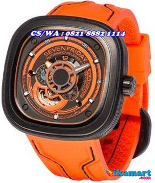 Six layers of orange and gun metal discs with “SEVENFRIDAY KUKA INSPIRED” printed in orange on gun metal. Hour: Orange hour hand filled with Super-Luminova®.