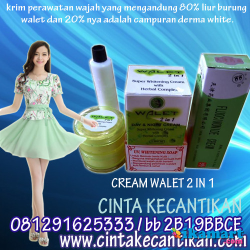 Cream Walet (krim walet) adalah krim perawatan wajah yang mengandung 80% liur burung walet dan 20% nya adalah campuran derma white. Memberi nutrisi pd kulit wajah,melindungi kulit dr paparan sinar matahari secara langsung&serangan radikal bebas