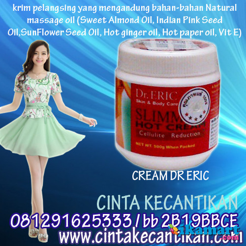 Dr. Eric Merupakan krim pelangsing yang mengandung bahan-bahan Natural massage oil (Sweet Almond Oil, Indian Pink Seed Oil,SunFlower Seed Oil, Hot ginger oil, Hot paper oil, Vit E) yang sangat baik untuk mengecilkan cellulite pada tubuh Anda.Dr. Eric Slimming Hot Cream netto 500gr asli, bukan 380gr. segitiga ke atas, aroma kuat. ORIGINAL