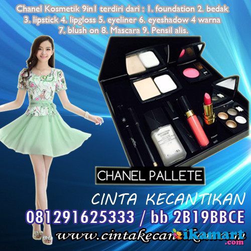 Chanel Palatte 9in1 :terdiri dari1. foundation2. bedak3. lipstick4. lipgloss5. eyeliner6. eyeshadow 4 warna7. blush on8. Mascara9. Pensil alis