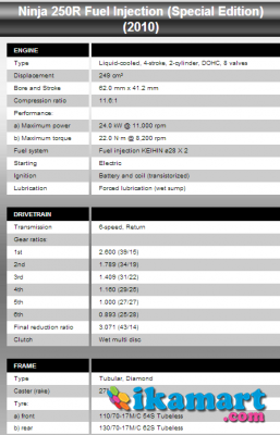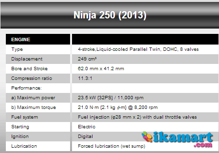 FYI : Ninja yg saya punya N250 yg di jual di pasaran Eropa, Thailand, Malaysia dari tahun 2010 (CMIIW). Import Utuh karena saya beli di IU dan hanya jual di Jakarta dengan produksi terbatas, yg saya tanya ke IU nya mereka hanya impor sekitar 30an (CMIIW). Apa bedanya sama Ninja 250 Injeksi yg baru. yg pasti beda fairing,spido, dll (penyegaran). Di leher knalpot ada satu alat (saya lupa namanya apa) . Untuk spesifikasi Mesin bisa liat gambar di bawah. Ninja 250 2010 & Ninja 250 2013
