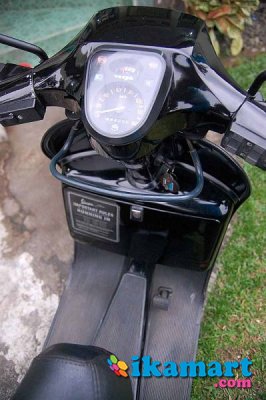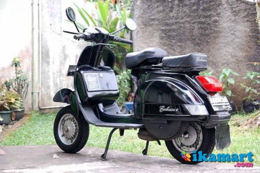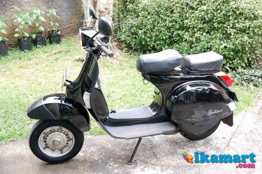 Teman hidup dari jaman kerja pertama sampe sekarang. Udah jadi belahan jiwa deh. Penggunaan normal lah, kecuali awal2 masih baru. Jamannya masih doyan ngebut. jangan percaya mitos, nih vespa tembus 120km/jam loh (tengah malem Semanggi-Pancoran). Terakhir diisi Pertamax ya bos. Cat item masih orisinil pabrik, bukan cat ulang. Spion dah ganti pake model retro, biar nggak keliatan ky pak guru. Spido masih jalan ya, jadi bisa cek bensin & kecepatan. Aki udah pake aki kering. Cover jok depan udah ganti, yg belakang masih orisinil pabriknya. Ban serep siap tempur.