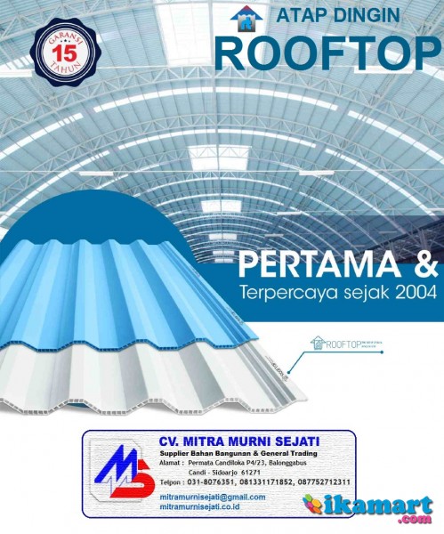 - Anti bocor, lapisan anti-UV, tidak menjalarkan listrik, hemat rangka dan gording